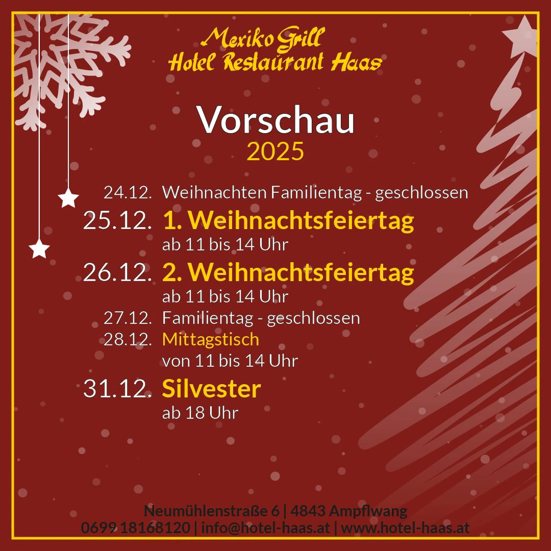 Donnerstag 25. Dezember 1. Weihnachtsfeiertag 11 bis 14 Uhr